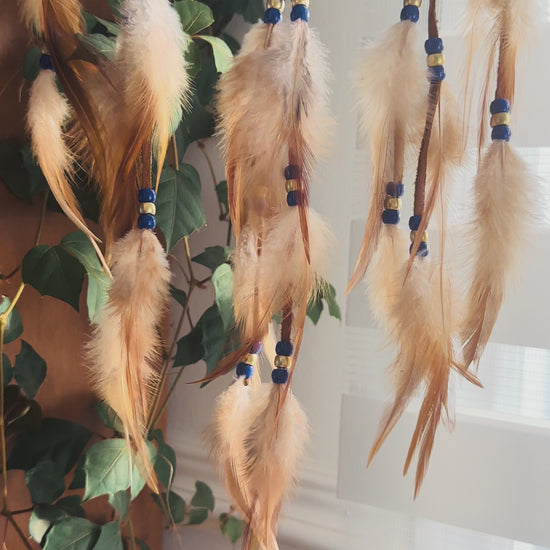 Ses plumes longues et légères, ornées de perles bleues et dorées, créent un mouvement doux qui apporte une présence chaleureuse à n’importe quel espace.