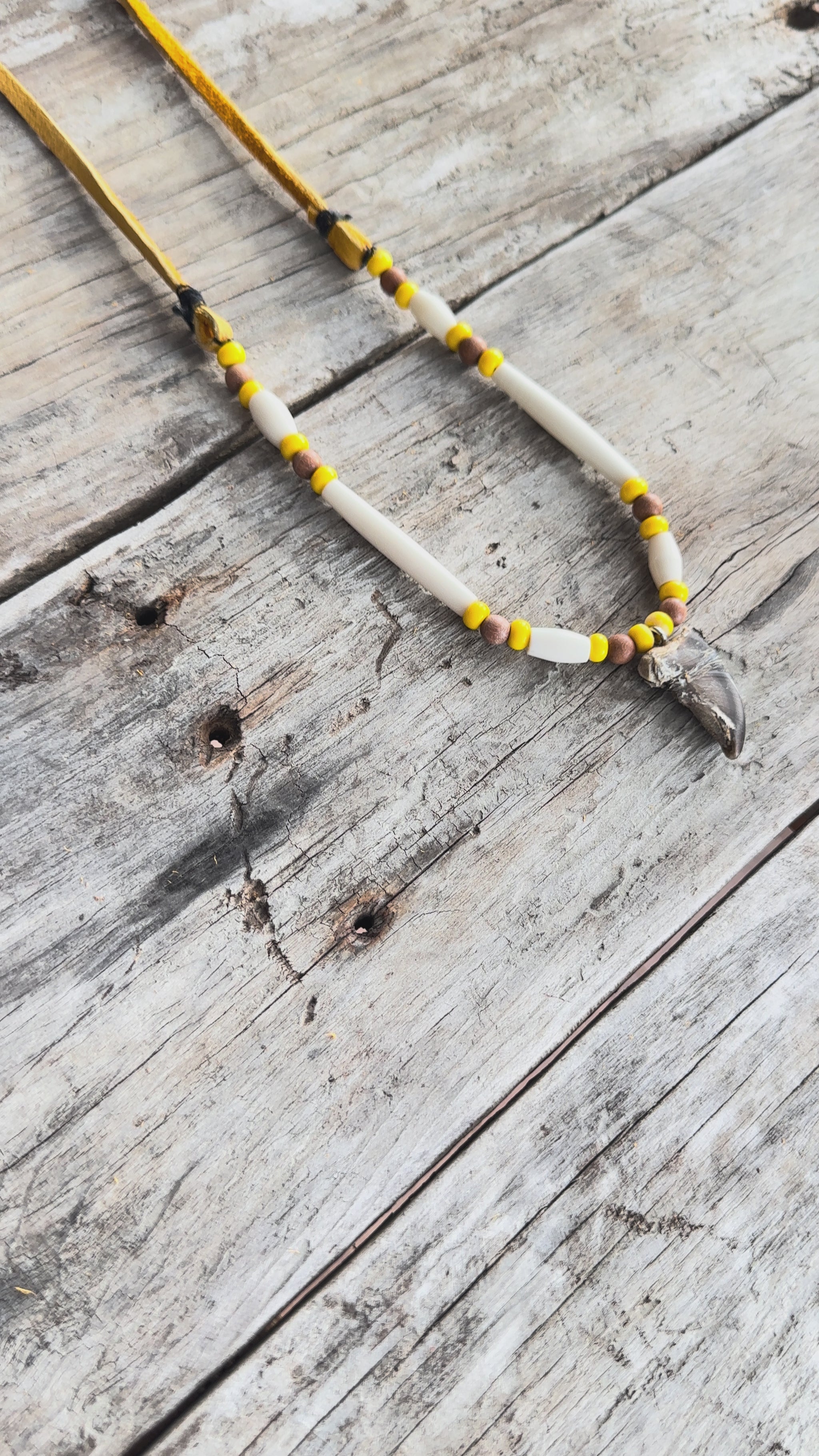 Ce collier haut de gamme est réalisé en cuir d’orignal 100 % véritable, orné de perles en os. Chaque modèle est unique.