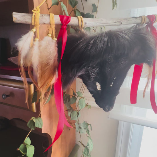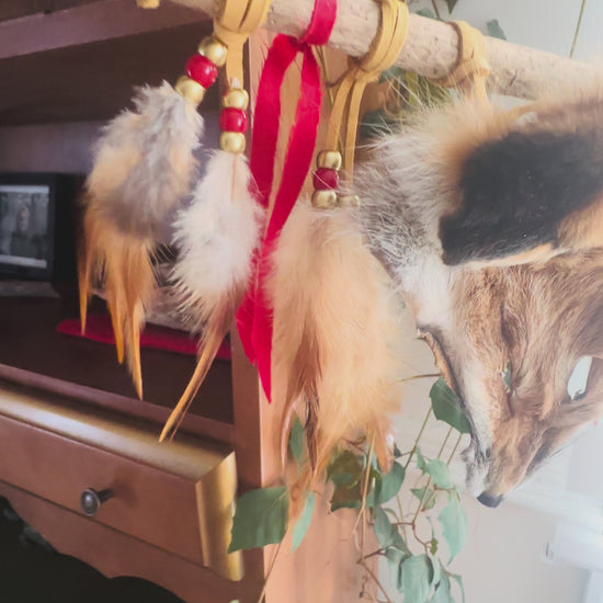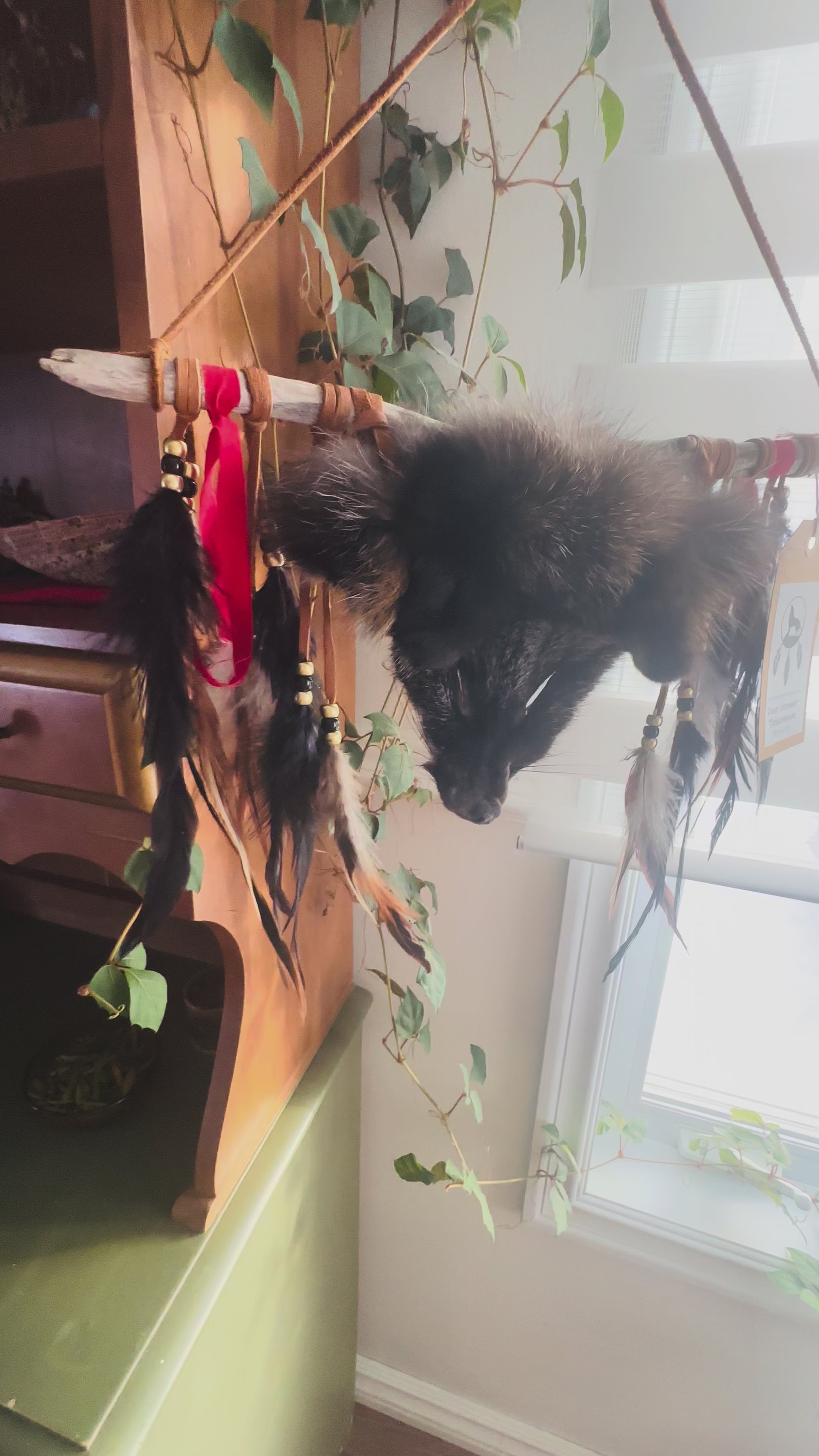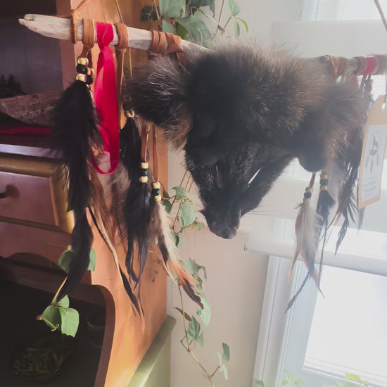 Décorations murales artisanales avec têtes de renard, créées à la main par un artisan autochtone. Chaque œuvre est unique et porte la symbolique de l’esprit du renard.