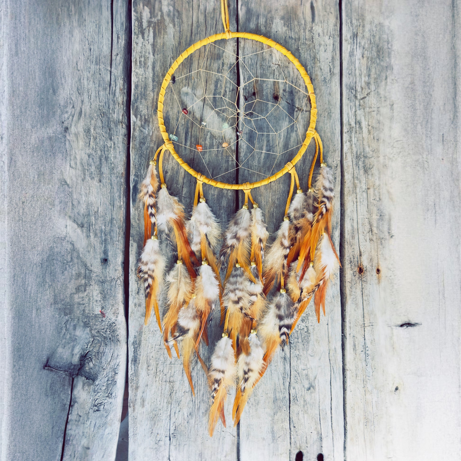 Der Kreis, umhüllt von 100 % echtem, goldgelbem Elchleder, symbolisiert heiliges Feuer, Weitergabe und innere Stärke. Das zentrale Geflecht ist fein strukturiert und mit farbenfrohen Naturperlen verziert, die das Licht sanft einfangen.
