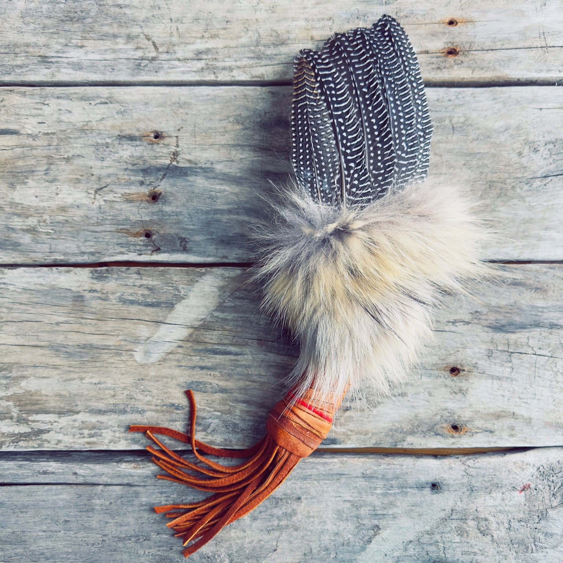 Die Gänsefeder vermittelt eine Energie der Erhebung, Klarheit und Verbindung zur spirituellen Welt, während das Kojotenfell instinktive Intelligenz, Anpassungsfähigkeit und innere Führung verkörpert.