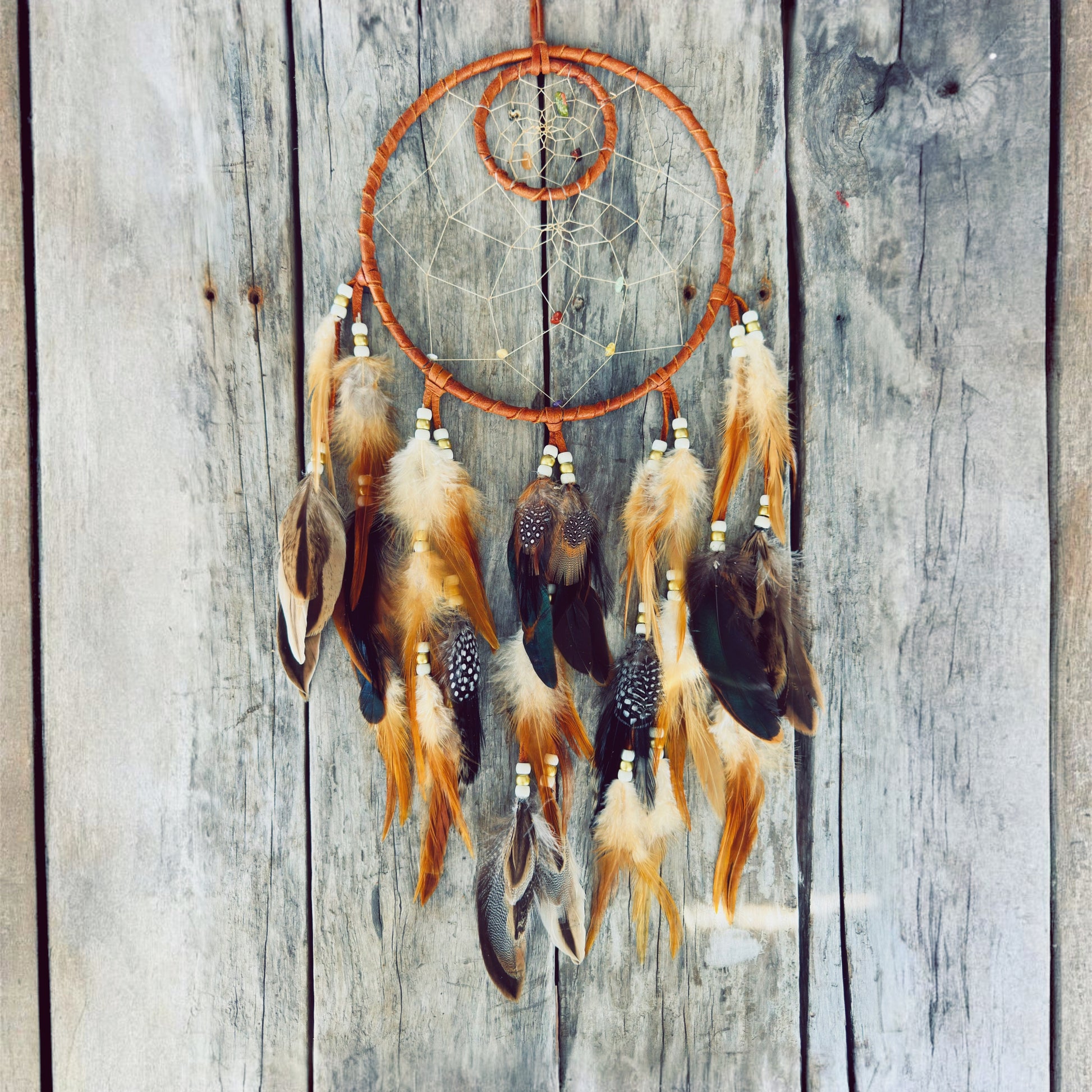 Este atrapasueños de doble círculo se distingue por una rica composición y una excepcional presencia visual.