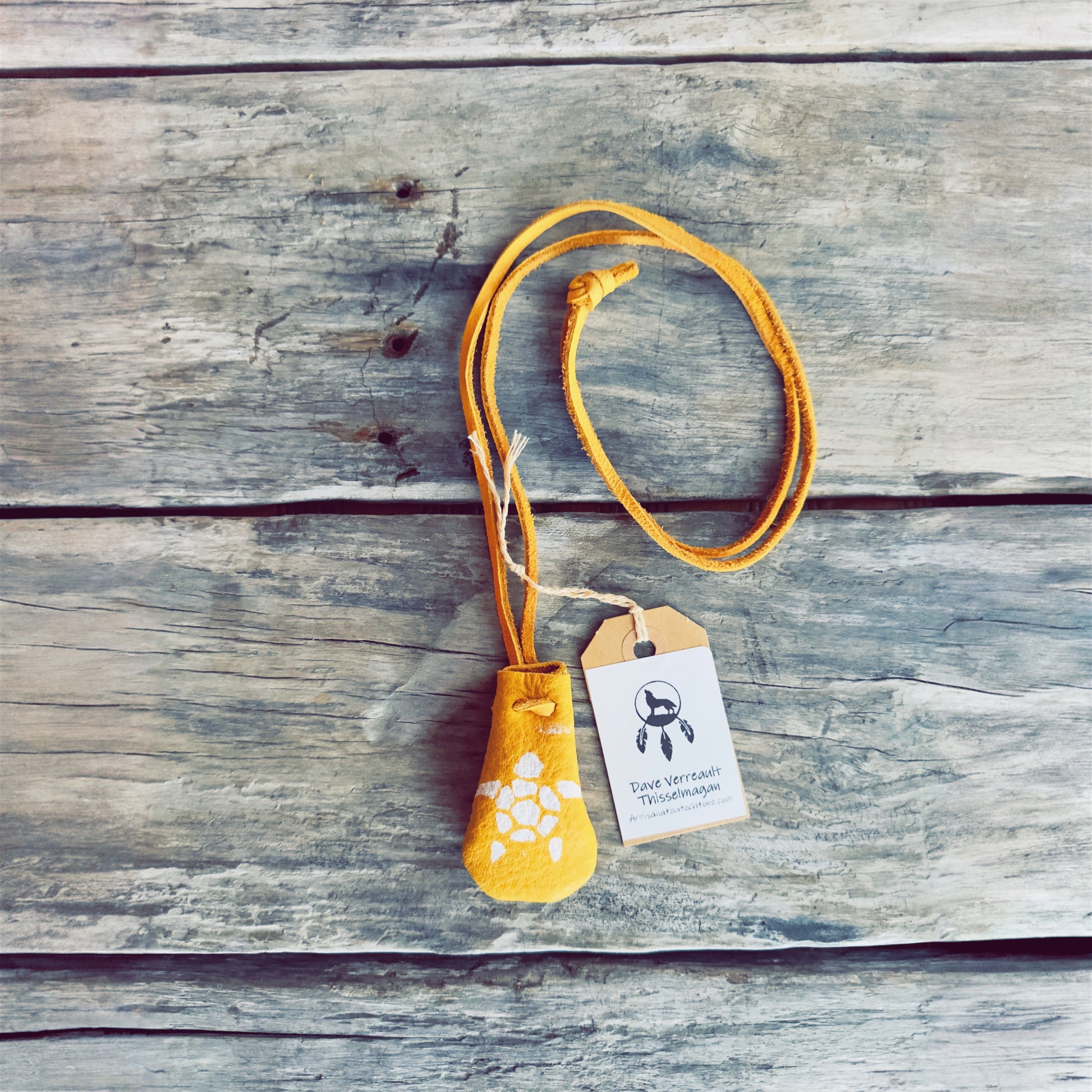 Chaque détail est pensé avec respect : le cuir d’orignal, choisi pour sa douceur et sa solidité, abrite un mélange purifié de sauge sacrée et d’une pierre semi-précieuse sélectionnée pour son énergie bienfaisante.